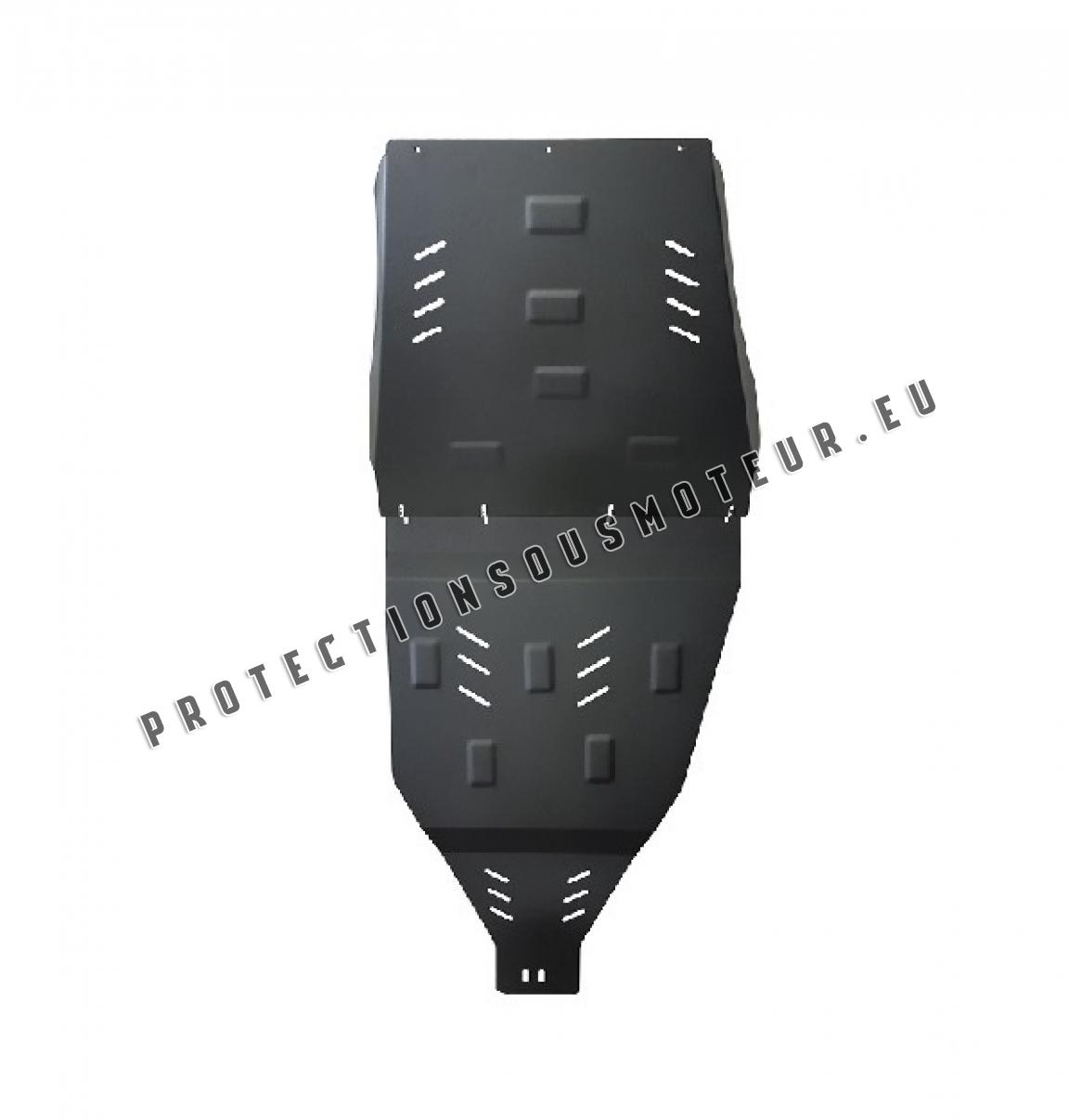 Le cache métallique protège: la boîte de vitesses, boite de transfert Le cache de protection est réalisé en Acier thermolaqué avec une épaisseur de 3 mm. Vis, écrous, pinces, tous les accessoires de fixation sont inclus. Toutes les plaques de protection sont revêtues de poudre pour prévenir la corrosion. L'extérieur de la plaque de protection est doté de renforts en Acier thermolaqué, ce qui augmente la résistance aux chocs. |
