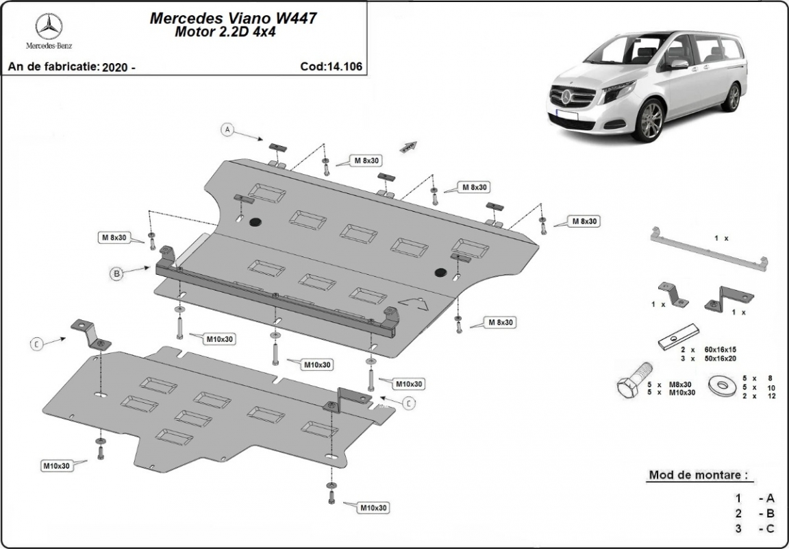Cache de protection sous moteur et de la boîte de vitesse Mercedes Viano W447 2.2 D, 4x4 (2020-2026)