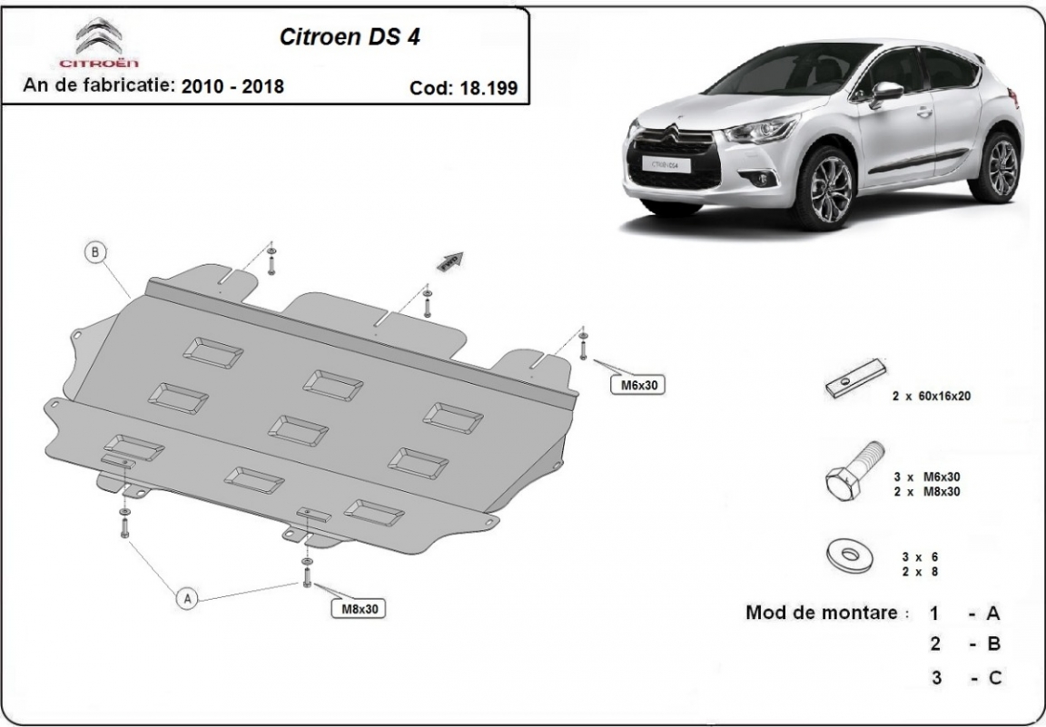 | Chaque voiture a des trous de vis fabriqués en usine pour le montage de la plaque de protection, ce qui rend le montage très facile. Vous pouvez le faire vous-même ou à n'importe quel point de service automatique. |