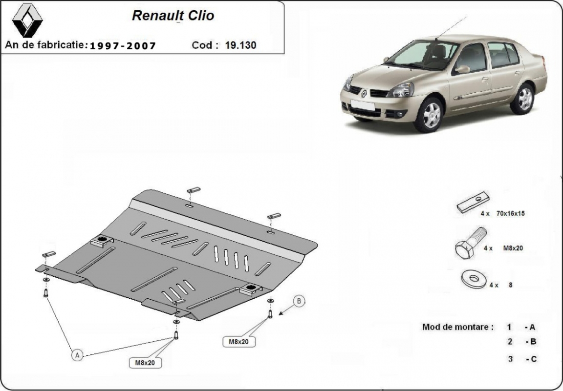 Cache sous moteur et de la boîte de vitesse Renault Clio 2 (1997-2007)